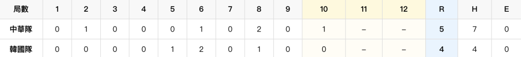 比賽最終在10局突破僵局制中出現戲劇性轉折,中華隊透過戰術短打成功推進跑者,由帶傷上陣的隊長陳傑憲代跑衝回致勝分。終場中華隊以5比4驚險擊敗韓國,不僅保住晉級希望,也寫下台灣在世界棒球經典賽史上首次擊敗韓國隊的重要紀錄。