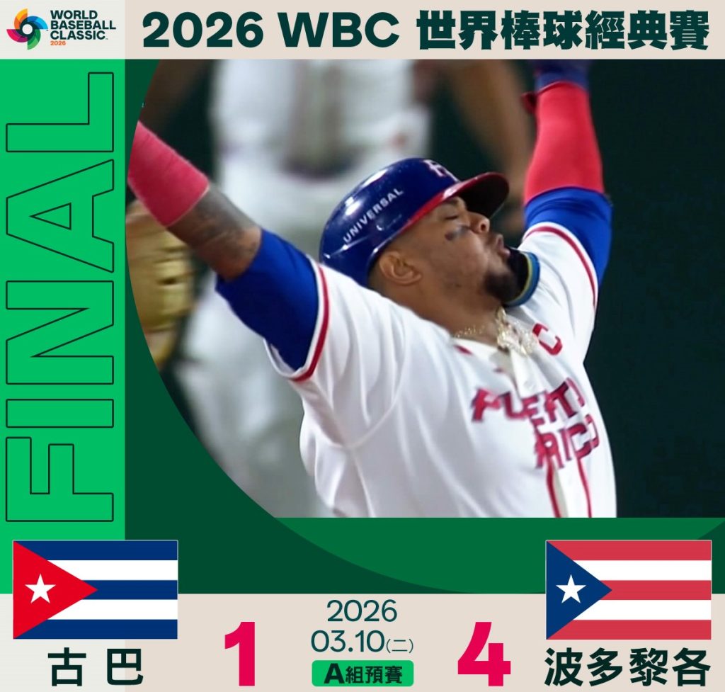 2026年世界棒球經典賽(WBC)持續進行,在備受矚目的WBC古巴波多黎各之戰中,身為A組預賽地主的波多黎各今(10)日迎戰傳統強權古巴。波多黎各在2局下打出關鍵3分攻勢,加上投手群聯手壓制古巴打線,最終以 4:1擊敗古巴,收下預賽第3勝,也成為A組首支晉級八強的球隊。